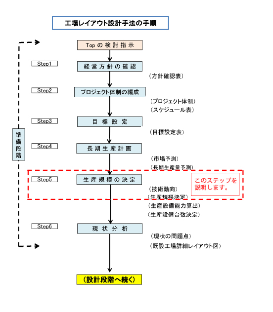 工場レイアウト設計の手法手順フロー図で「生産規模の決定」作成の位置を示してあります。